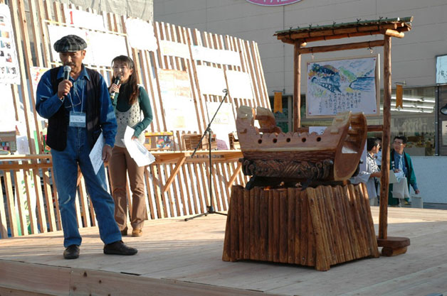 特別賞:ファニチャーというテーマを越えて、杉を愛する気持ちが感動を呼んだ、河崎武夫さんの「古代舟」。なんと河崎さんの手による杉の一刀彫。