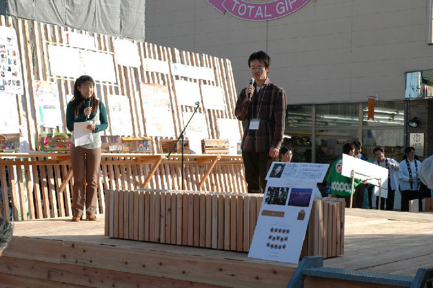 審査風景:審査日は晴天に恵まれ、大勢の市民も同席した。ステージはやはり地元製作の杉舞台。審査委員長の内藤廣さんも見える。