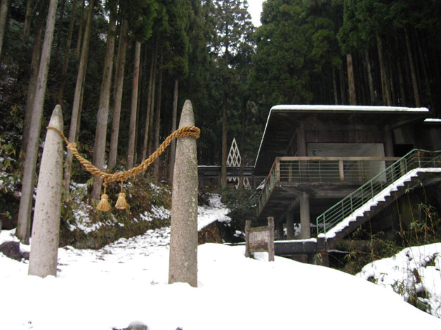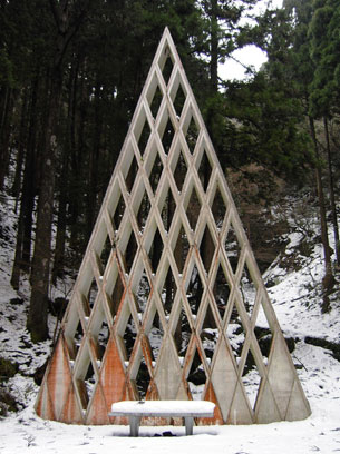 (下)鳥取県智頭にある日本で唯一の杉神社。ご神体は、杉をかたどったコンクリートの塔。