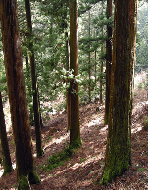 吉野の杉山。日が射し込む明るい林は、きちんと手が入れられている証拠。 |