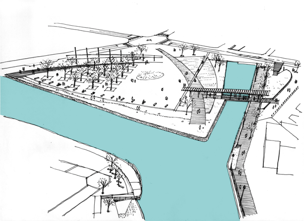 木橋が架かる緑地広場のイメージスケッチ
