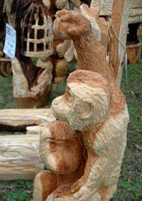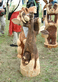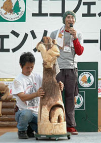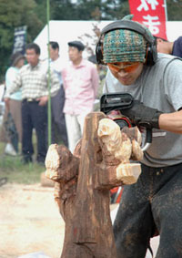 感心するのは参加している皆さんの造形力の高さです。チェーンソーの運転テクニックは元より、基本的な造形センスがないとできない競技です。他のエントラントがどんな作品をつくっているか見回してみると、熊や猿、鷲といった大物が多く、その中にあって梶谷さんのは異色な感じもしますが、その作風は好感が持てるものです。梶谷さんが彫り出す小さな動物達の愛くるしい表情は絶妙です。こう言っては角が立つかもしれませんが、家の玄関にでも飾ろうとするならリアルで迫力ある鷲や熊よりも梶谷さんの作品の方が向いてるんじゃないかと思います。<画像6>