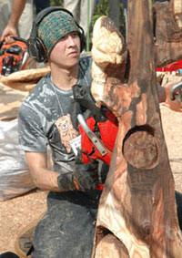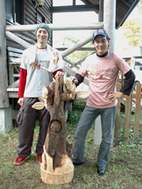 今回の競技テーマは森の動物たち。梶谷さんは何やらリスと熊を彫っているようです。割と小ぶりな動物達を細かい技で仕上げてゆきます。月刊杉の記事では軽快でテンポ良く、かつするどい切れ味の文章でチェーンソーについて語ってくれている梶谷さんですが、カービングもそのままの個性が出ています。とにかくねー、形が決まっててメチャカッコいいんですわぁー。おっと、いかん、いかん!(汗)