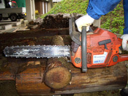 初めてチェーンソーを使うとなったら、やっぱりなんだか怖いですよね。どうしても腰が引けてしまうし、アクセルを握る手も弱々しくなる。でも、それではダメでして、きちんと腰を入れて、アクセルは基本的に全開で使うものと思って下さい。 あっと、その前にエンジンはかかりましたでしょうか。前号において、エンジンをかける際に引っ張るスターターロープは引きが軽いものをお勧めしましたが、これは結構大事ですよ。スターターロープを引く時は、チェーンソーを固定することが大事です。地面におく(写真1)か、慣れてきたら股に挟む(写真2)かして引きましょう。 チェーンソーには切るところが二カ所あります。分かりますか? バーの上側と下側です。この上側と下側をうまく使い分けて切ります。基本的には、もちろんバーの下側を使ってチェンソーを上から下に動かして切ります。しかし、木の状態や場所の制約があったりする場合は、上側を使って下から上に切り上げることもあります。 いずれの際も気をつけることは、なるべくバーの真ん中よりも手前を使うということです(写真3)。これはこちらの方が楽なのと、なにより安全だからです。 チェーンソーを使っていて一番怖いのは、キックバックという現象です。これは本当に危険です。 キックバックとは、チェーンソーを使っているとき、バーの先端上部(写真4)が不用意に当たった場合、バーが跳ね上がる現象のことです。例えば、下から上に切り上げようするとき、バーの先端で行ったりすると起こります。凄い力で跳ね上がるので大変危険です。 もちろんチェーンソー自体にも安全対策が施されていて、キックバックが起こった時は、自動的にチェーンの回転が止まるようになっていますので、過剰に恐れる必要はありません。 さて、使い終えたら手入れをしなければなりません。 チェーンソーは刃物です。刃物は研がなければ使い物になりません。 チェーンソーを購入したら、丸ヤスリが付属品としてついてきたと思います。これを使って刃の目立てをするのですが、そのやり方はソーチェーンの種類によって異なるので、ご自分のチェーンソーの取扱い説明書に書いてある方法に準じて下さい。 私が目立てについて言えることは、様々な目立て補助用具(写真5)が販売店やホームセンターにあるので、それらを使おうということです。丸ヤスリは消耗品ですから、研いでいて滑るような感覚になったら交換しましょう。 正直、目立ては難しい。それでも、チェーンソーを使うことと目立てをすることは、二つで一つだと肝に銘じてがんばって下さい。 以上、簡単に使う際の心得を書きました。次回は、「チェーンソーを安全に使うために」と題して書きたいと思います。要望や質問がありましたら、お気軽にコメント下さい。 ●<かじたに・てつや>吉野の山仕事師 奈良県吉野で山仕事を本業とするかたわら、チェーンソーアートを中心に「杉の木を使ってできること(出来杉計画)』に取り組む。