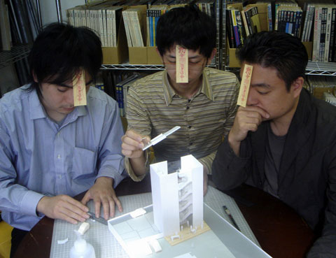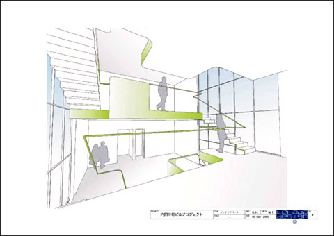 しばらくして、寺田さんから電話があった。「若杉さん、建築計画独断で形まで創っちゃっていいですか?別にどうなろうと構わないんです。つくらないと僕のそして所員の気持ちがおさまらないんです。」しばしの夢が頭の中をグルグルと回った。見てみたい!!「お願いします、そして何とか社長に見てもらう時間を捻出します」とっさに答えてしまった。また例のリズム「悪のり」を体が刻み始めた。学生インターシップの発表会パーティーの会場に僕らはいた。何の関連もないのだが、社長に見せたいものがあることだけ伝えてある。多くの学生でごった返す会場で、寺田さんがプレゼンテーションを行った。