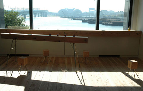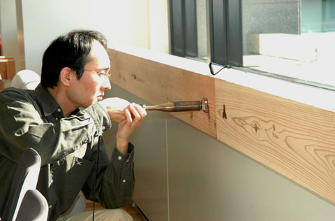 またまたそんなとき、都合よく石田紀佳さん(以下ノリスケさん)がクラフトのアーティストを集めた「工房からの風」という企画がまたまたあるじゃあ〜りませんか。「きてる、きてるこれは偶然ではない、もはや必然なのだ〜。杉のクラフトを使えということなのだ〜」と神の啓示を得て、フガフガ千葉のコルトンプラザへ出かけました。早速、ノリスケさんへ協力を依頼し、スギダラケの空間を盛り上げる小物のコーディネーションを進めてもらう事になりました。床は杉材の床、ファンコイルカバーを杉のボーダーで隠す(ちょっとしたカウンター代わりで、結構良いんです)そして新作スギダラ家具(まだ大半が製作中で、次回に紹介いたします)は宮崎、川上木材さんから、壁材は天竜、丸八製材所さんにお願いし、スギダラオフィスへとばく進しました。そして11月15日、ようやくスギダラ家の序章スギダラオフィスが完成したのでした。
