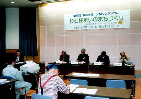 森の学校は夏・秋・冬・春、秋、夏と4年がかりで6回開催、もちろん毎回来る人もいました。季節に応じて二ツ井町の自然の風景が全く変わりますので、来る度ごとに感動が深まります。毎回開催地区をかえ、民泊やら杉の公民館やら、野宿やらと、いろいろな体験と話に花を咲かせました。参加者の感想は、それぞれ、さまざまですが、いつも、次の言葉が頭に残っています。「今回いろいろな方から受けた様々なやさしさを必ず誰かに、あるいは、何かに対してお返ししたい」と、とてもありがたいメッセージでした。4年間の活動を終えて、公開シンポジウムを2001年8月25日開催しました。その中から、いくつかの報告を紹介します。