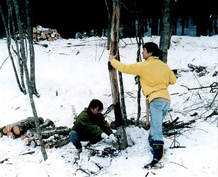 1996年からスタート、春夏秋冬で合計6回開催した四季の学校は、朝から夜まで丸3日間のスケジュールで開催しました。東京から訪れる人は、木曜の夜出発し、金曜の早朝7時、二ツ井町に到着、そこから、金、土、日の3日間、白神山地、秋田学術参考林、杉の混交林、杉林の整備作業、製材所、木工所、杉の民家や公民館と、杉だらけの62時間を、さまざまな専門家と共に、整備作業を行いながら過ごす学校です。日曜の夜9時、夜行バスで帰り、月曜日そのまま出社という今から考えればあきれる行程をおこないました。前後の移動を考えると3泊5日。参加する人も迎える町の人も、すべての人が先生であり、同時に、生徒であるというコンセプトで、春夏秋冬の、杉と私達の暮らしを見つめ直しました。山人と生活者が交流するこのツアーの名称を「森で遊び林業を考える学校」としたのは、このためです。