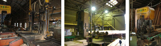 (写真左、中)送材車付“帯のこ”盤です。左の写真の右手前に写っているのが送材車です。これに原木を載せます。(写真右)テーブル“帯のこ”盤です。両サイドに人が立ち、押したり引いたりして、寸法を調整していきます。