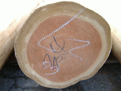 さらに木全体の姿を見ます。やはり曲がりの少ないものを選びます。曲がっている木は木取りが悪いからです。木の表皮も見ます。枝の跡があるかないかを見るのです。伐採した時に切り落とした枝の跡は僕でもすぐに分かりますが、表皮の残る節の形を見て、「枝打ち」がいつ頃行われたかを推測するのは経験の成せる技です。「枝打ち」とはご存知の方も多いかと思いますが、木の育成中に枝を切り落とす作業のことです。枝打ちの時期が早ければ、節は芯の付近でなければ出てきません。つまり製品(柱や梁材など)とした時にその表面に節が出る確率が少なくなるわけです。枝打ちの時期が遅ければ、表皮近くで節が出てくるので、製品の表面に節が出やすくなります。木材の世界では節の少ないものが良いものとされているので、なるべく節が少なそうな原木を選ぶわけです。