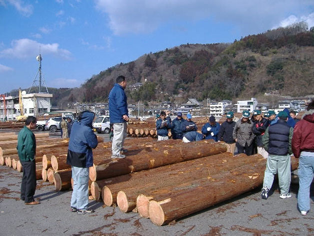 どこの原木市場でも同じセリのスタイルのようで、「振り子」と呼ばれる市場の職員さんが、原木を1本ずつセリにかけていきます。振り子さんの「さあ、こちら5万から〜」という甲高い掛け声に、我々買い方は購入の意志を伝えます。ライバルがいなければ落札というわけです。ライバルがいれば、価格が上がっていくわけです。当たり前ですが……。