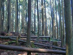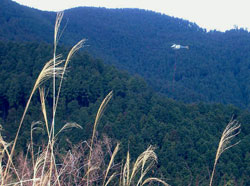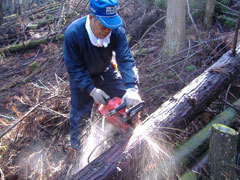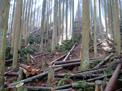 こちら吉野で春と言えば、桜です。 3月下旬から吉野山の桜が咲き始めます。桜前線が約1ヶ月かけて山を上っていく様は圧巻。一目千本と謳われる山桜の饗宴です。休みの日は多くのお花見のお客さんで賑わい、大変な混雑です。吉野山のお花見は、桜の木の下で宴会という一般的なお花見ではなくて、散歩しながら桜を眺めるというスタイル。ドンチャン騒ぎのお花見も楽しいですが、吉野山の優雅なお花見もこれまた一興です。 平日であれば、比較的落ち着いて見物できますので、どうぞ皆様、有休を取って来てくださいね。(ちなみに僕はここ吉野で高校まで過ごしましたが、吉野山にお花見に行った経験がありません。どうも近すぎると逆に足が遠のいてしまうようで……。だから毎年春は遠目に山を眺めていました。それでも山がピンク色に染まっていく様子が分かるのがすごい。今年こそは花見に行こうと思っています。) さて、本題に入ります。今月も製材所の仕事を覗いてみる事にしましょう。 先月は原木市場での仕入れの様子をご紹介しましたが、今月も原木のお話を。 と言いますのも、当社の持っている山で間伐が行われ、そこから間伐材を出材する事になったので、その様子をご報告しようと思うわけです。吉野では起伏の激しい山々が多く、山から木を出すのにヘリコプターを利用することが多いので、ダイナミックな出材現場を見ることができます。今月はその迫力の現場をリポートします。 奈良県川上村東川。 これ「ひがしがわ」ではなく「うのがわ」と読みます。 川上村は吉野林業の発祥の地。優れた人工造林技術を有しており、さらに豊かな土壌が良材を育てます。吉野杉、吉野桧としてブランド化されている吉野材の中でも、川上村産は特に良材が多いことで有名です。また東川は自然の宝庫。空気はどこまでも澄み切って、清らかな小川の流れにはアマゴの群れ。そしてホタルの里としても知られ、無数のホタルが飛び交う様子は、まさに自然のルミナリエ(東京ではミレナリオ)。こんな素晴らしい環境の中で育まれているわけです。(写真1,2) 東川の山は50年生の杉と桧がすくすくと育っております。杉が8割、桧が2割。正真正銘の吉野杉と吉野桧たちです。約50年で高さ15m、直径20cmほどに成長しました。 この東川の山で昨年秋ごろに間伐を行いました。間伐とは良質な材を優先して育成していけるように間引きを行うことです。切り倒された木々はそのまましばらく山に置かれます。これを葉枯らしと呼びます。 葉枯らしとは、伐採現場で木材を予備乾燥させる処理のことです。杉は伐採直後の含水率が約150%、つまり杉自体の重さの1.5倍もの水分を含んでおり、出材作業に多大なコストと労力がかかります。そのため、伐採現場で根株を切り離したら、枝葉を付けたまま穂先を山側に向かって倒します。枝葉を通して水分を蒸発させ、自然乾燥させるわけです。この葉枯らしにより、黒芯材(赤味部分が黒い材)の渋味が抜けて、吉野材の特徴である淡紅色になるなど、出材コストの低減の他にもいろいろメリットがあるようです。 (写真3)