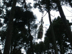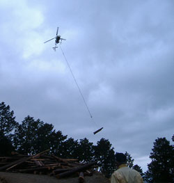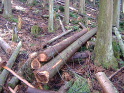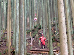 約半年が経過し、杉の含水率は50%程度にまで下がりました。さて、ここから木を出していくわけですが、15m程の長さの杉であっても、当然のことながら先の方は細く、使える部分を切る必要があります。杉は3〜4mごとに切られることが多いのですが、この作業を玉切りと呼びます。そして、玉切りされた丸太は株のほうから元玉、2番玉、3番玉…、末玉といいます。元玉と2番玉は高値で取引されることが多いそうです。これは株に近いほうが節の出る確率が少ないからです。 3〜4mごとに小切りされた杉は7〜8本毎にワイヤーでくくられます。ヘリコプターで吊り上げるためです。 ヘリコプターによる出材はコストが高いため、全国的には少ないようですが、吉野では山の起伏が激しく、高低差も大きい為、ヘリコプターが重宝されます。またトラックが通れるような道を付けるくらいなら、その土地に木を植えた方がいいという考えもあったようで、林道や作業道の整備が進まなかったということもあるようです。 一昔前まではヘリコプターを使っても十分採算が取れるくらいに、吉野杉、吉野桧の価値は高かったというわけです。現在では、今回のような50年生の間伐材は出材されることは少なく、山にそのまま捨てられることが多いようです。今回の出材でも全ての間伐材が出材されるわけではなく、一部は山に放置されます。つまり売り上げ以上に出材コストがかからないよう、収支で損をしない範囲でしか出材ができないわけです。50年かけて育った木が日の目を見ないのは本当に残念ですが、これはなかなか難しい問題です。(写真4〜6)