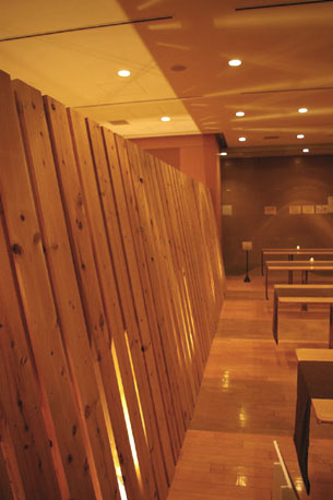社員食堂が会場となるのですが、そのままではあまり風情が無いので、杉材を使ってインテリアを即興的に改造する案が考案されました。食事を置くテーブルは食堂用のテーブルに杉の角材の長モノをドーンと置いて、見苦しいところには杉の板材でフェンスを作りました。もちろん、みんなで施工です。