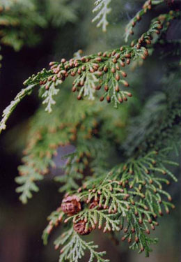 ひのきの葉先にも雄花のつぼみ
