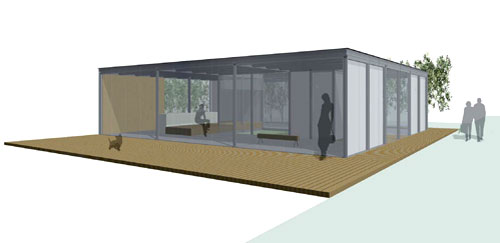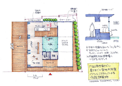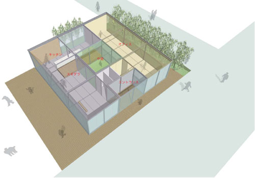更地になった土地に、寺田さんと開発した製品を使って仮設建築をつくってしまおうという計画である。近代的なモダンな建て家に対しスギダラ家の空間。アルミを使った構造体をベースにガラス張りの平家建て、モダンになったものの中はまさしくスギダラ家である。
