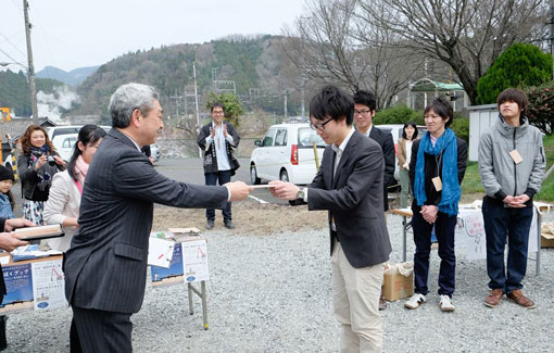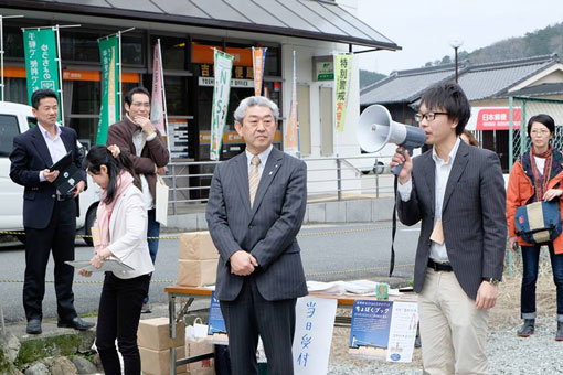| 吉野貯木まちあるきの出発式で、吉野町の北岡町長より辞令を交付される筆者。 | |||||||||||||||