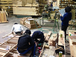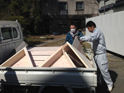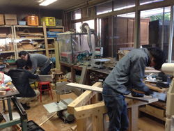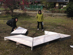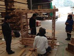 | 28日の製作メンバーは羽原さん合わせ美山木匠塾は4人。そこへ、川上村地域おこし協力隊の村上さんが手伝いに来てくれました。梯子を組み合わせてヤタイとなるため、組立てのときには、 「きつすぎてはいらない〜!」 「ここもっと削らないと!」 「そっち持ち上げてよ!!!」 など声をあげ、微調整の繰り返し。頂いた杉材がとてもよい木でズッシリとした重量感。 「腰が痛い!」「寒い!」 など愚痴をこぼしながらも(笑)なんとかその日のうちにはヤタイのカタチに。バチっと一回で組み立てられないあたりが木材の扱いの不慣れさを表しており、これからまだまだ修行すべしだなぁと感じる時間となりました。 |