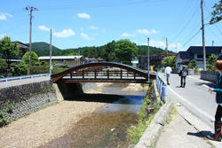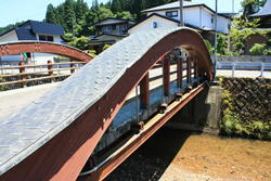| さて先日、秋田杉を利用した木橋と木製ダムを見学に行きました。担当教官は佐々木貴信先生。(佐々木先生は、以前能代の秋田杉のオープンカフェを開催するときにお世話になった先生です。)佐々木先生は木でつくる土木構造物の研究がご専門で、この日は五城目町湯の又にある平成2年にかけられた、構造用集成材を主要部材に用いたタイドアーチ(集成材)橋を見に行きました。この橋は町道にかかる湾曲集成材と鉄のハイブリッドで、長さ13.54m、幅員6m。五城目営林署の樹齢70年以上の秋田杉間伐材(最小口径30cm)207本から作られたそうです。アーチ主桁部の上面には装飾を兼ねて庇をつけた銅板屋根がついており、まるで2匹の竜が横たわっているようでした。 | ||||||||||||||||