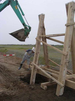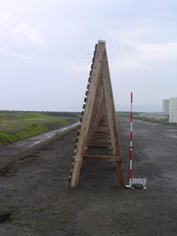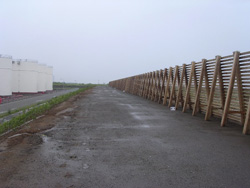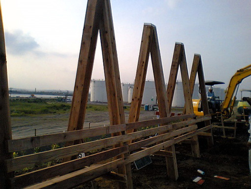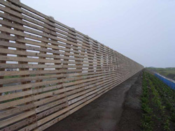 さて、話の中に挿絵のように出ている写真は、宮崎東港の防風柵です。長さは、300m。高さ3mあります。150cm角4mが、300本。2×4材を横木は、1500本使いました。約40立方です。コンサルタントの濱本朋久さんと入念に構造の打ち合わせをしました。最大減風効果を発揮する素材の組合せと背後施設にどの程度の減風効果があるかを2次元流体解析しました。施工方法も自前で考えたのです。通常この手の防風柵は、鋼製なのです。それを敢えて木製が採用されたのです。しかも、価格は、鋼製の半分の価格で!!2007年のグッドデザイン賞を受賞しました。