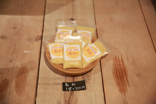 西粟倉の名前にもなっている「粟(あわ)」ですが、実物を見たことがないという方も多いのではないでしょうか?穂の状態は、きつねのしっぽのようで、キツネ好きの大島夫妻からはとても愛されております。旧東粟倉村の美作市地域おこし協力隊の皆さんが育てられた、「あわ」を、入れていただいたときは小躍りでした。 |