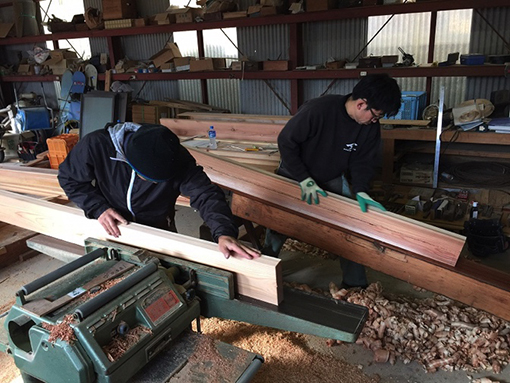 | ヤマロク醤油の山本康夫さん(右)、坂口工務店の坂口直人さん(左)。同級生の二人が側板を削っています。桶は寸胴型ではないので、まっすぐ削るのではなく、微妙な角度をつけながら削ります。そうすることで、強くて美しい桶のプロポーションが生まれます。 | |||||||||||||||