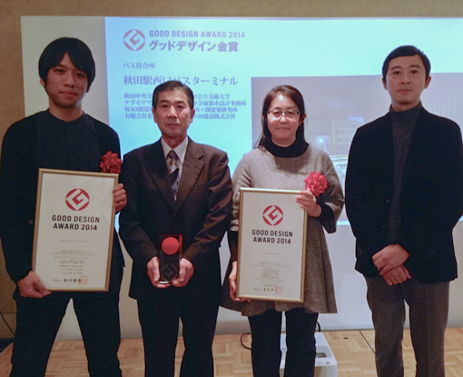 ようやく桜が見頃となり暖かくなってきた昨年の4月中旬、あきた産業デザインセンターの武藤さんから今年度のグッドデザイン賞に秋田杉のバスターミナルをエントリーしませんか、とお声がけいただく。秋田杉のバスターミナルも無事一冬を過ごし駅前の風景としてすっかりなじんできて、特に夜景の美しいことでも評判が良かったので、これは応募する良いチャンスと思いデザイナーの南雲さんに相談したところ、秋田とバスターミナルのピーアールを考えれば応募しないてはない、とご快諾をいただき、プロジェクトに関わった8社で応募することになる。 4月末にエントリー登録、5月15日に秋田で応募説明会があり、6月10日1次審査応募完了。7月15日に選考結果が発表され、無事一次審査を通過。8月26日から28日に東京ビッグサイトで行われる二次審査会に向けて、A1パネルとA3のプレゼン資料を作成。短い審査時間の中でインパクトのあるパネルのデザインが重要とのことで、シブヤスタジオさんが竣工時に撮影した夜景の写真をメインにしたレイアウトに決定。出力と会場への搬入展示はナグモデザイン事務所の出水さんにお願いして、二次審査結果通知を待ち、めでたく二次審査通過。なんとベスト100に入り、大賞候補にも選出された。 10月11日(土)から13日(月)には東京ミッドタウンでベスト100プレゼンテーションが行われ、私は13日にプレゼンテーションに臨んだ.会場には小野寺さんと渡邉さん、美大の同僚の先生も応援に駆けつけてくれて、なんとか落ち着いて5分間のプレゼンテーションを終えることができた。次は10月31日から11月4日に東京ミッドタウンで開催される受賞展「GDE2014(G展)」最終日11月4日に大賞候補のプレゼンテーションだ。 会場はホテルリッツカールトン。900人は入るという会場でかなり緊張した。秋田から中央交通の伊藤専務、渡邉さん,出水さん、そして宮崎支部の海野さん、美短の卒業生など、たくさんの方に励まされていよいよ登壇。大型スクリーンに映し出されるスライドをバックにステージ中央へ。無我夢中の5分間。投票の結果、順位は9社中7位、特別賞として金賞を受賞することができた。海野さんの軽トラ屋台は「ものづくりデザイン賞」を受賞、スギダラからG賞特別賞が2つ出るという快挙を成し遂げた瞬間だった。 |