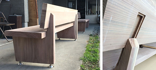 良いものが出来るときはいい素材、良い技術が必ず必要である。海野さんとはようやく阿吽の呼吸で価値観が伝わるようになった。今回設置したベンチがその場の風景となり、訪れる人々に気持ちのいい時間を過ごしていただく場になる事を願っている。 |