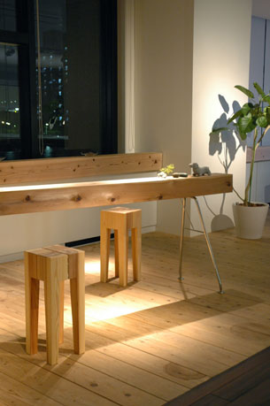 いざ完成してみると、意外に個性が強くて置かれる場所や合わせる家具を選ぶこと、こだわったはずの面取りの仕方が思ったほど効果的でなかったこと、やはりジョイントの強度が不安なことなど問題、課題が続出。そもそも原価10万!! いくらで売るんだッ!? これではデザイナーではないですね。形状的に杉パーツの加工が大変だったようです。ただ、材木屋さんのご好意で節の無いキレイな材を使っていただけましたし、プロポーション的にはほぼ思うようにできたので、そこは良かったと思っています。