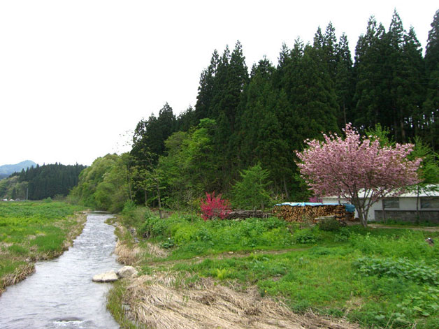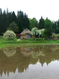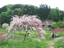 そんな宝物を探しに、5月19日、スギダラ秋田支部営業部長の明杉さんと一緒に、県北部にある八峰町の手這坂茅葺き民家集落を訪れました。ちょうど桃の花が満開!あたりは甘い香りが漂い、川のせせらぎとウグイスやカッコウの「本物」の自然のBGMまで聞こえてきます。江戸時代の三河の紀行家、菅江真澄がこの地を訪れ「桃の花が咲き誇り、まるで桃源郷のようだ」とその眺めを讃えたのもうなずけます。