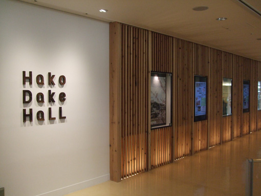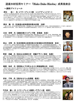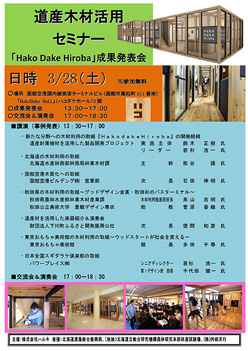 オープンから4ヶ月後には、今回の取組の成果発表として「道産材活用セミナー」を行った。セミナーの講師には、検討メンバーやスギダラメンバーの他、日頃お世話になっている方など、これ以上はいないと言う程、贅沢な講師陣が集まり事例発表等や漫才(若杉さん千代田さん)が行われた。講演の合間には、道産材で出来たギターでの演奏会やJAZZコンサートなども行われた。そしてこの日、ついに現れた「ハコダケ君」が会場を盛り上げ、こちらも大盛況のうちに幕を閉じた。 |