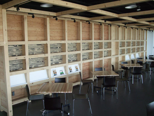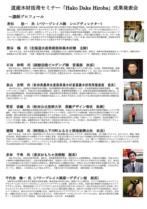 以前、月間杉81号で書かせていただいた旭川での「針葉樹活用セミナー」から約1年が過ぎた頃、セミナーの仕掛け人だった、北海道上川総合振興局林務課の佐藤司さん(以下、つーさん)が私の地域の渡島総合振興局の林務課へ異動してきた。数ある振興局の中でうちへ来るとは運命か?針葉樹活用セミナー&飲み会で南雲さん、若杉さんからスギダラエキスを最も注入された変態2人が出会ってしまった。セミナー後に「スギダラ針葉組合」と「スギダラ道南支部」をそれぞれ立ち上げたものの、これといった活動はなく、会う度に「何かできないかね」と話していた。そんなある日、つーさんから連絡が入った。「地域材利用開発事業という補助事業が出たけど、何かできないかな?」この事業は、今までにない地域材(道産針葉樹)の使い道等をデザイン・試作・実証できるという事業で、確か連絡を受けたのが木曜で翌月曜までに返答をしなければならいということだった。事前に準備していたならすぐに対応できたが、何もなく、考えた。ちょうど少し前に札幌支店の移転・改装のお手伝いをさせていただいていたこともあり、すぐに鞄燗c洋行が浮かんだ。そしてもうひとつ浮かんだのが函館空港ビルデング鰍セった。これも少し前に潟nルキが遊び半分で開発した「スギックモック」を購入、木育イベントをお手伝いさせていただいており、木材利用の取組みに理解のある人(石田次長)がいるのを思い出したからだ。そのことをつーさんに伝えると「いいね!でも、それだけでは弱い≠フで研究機関も入れた方がいい」という助言を得て地方独立行政法人北海道立総合研究機構森林研究本部林産試験場(以下、林産試験場)に協力してもらうことにし、要請はつーさんに任せることにした。 |