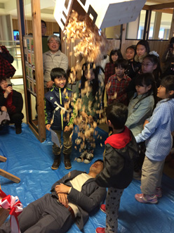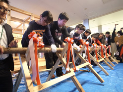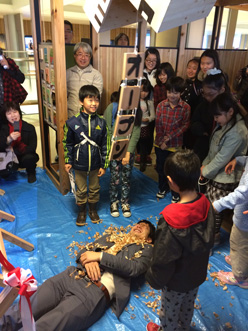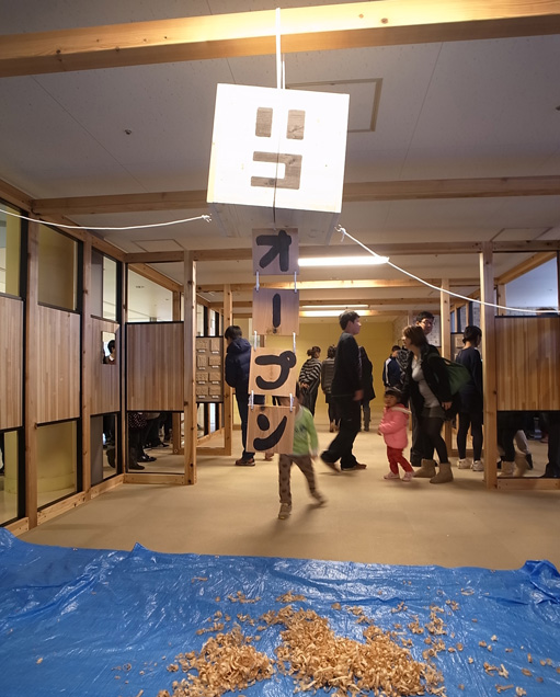 | そして、いよいよ平成26年11月29日のオープンを迎えるのだが、オープン当日は関係者や検討メンバーが集まるだけでなく、木工レリーフ作品を作った小学生を呼び、オープニングセレモニーを開催することになった。セレモニーの初めに若杉さんよりお言葉をいただいた。若杉さんは子どもたちに対し「みんなの作品がこの壁に展示されていますね。このコーナーは君たちみんなも一緒に作ったということです」この言葉で子どもを含む会場にいる全ての人との一体感が生まれた。次に子供たちによるテープカット、ではなく「丸太カット」、くす玉割りではなく「くすハコ割り」を行ったのち、木工レリーフ作品の表彰式を行った。そして、いよいよ!「どうぞ遊んでください!」の掛け声の後、「待ってました!」と子ども達が一斉に遊具に向かった。この時の笑顔は今でも忘れられない。 こうしてオープニングセレモニーは大盛況に終わった。 | ||||||||||||||||