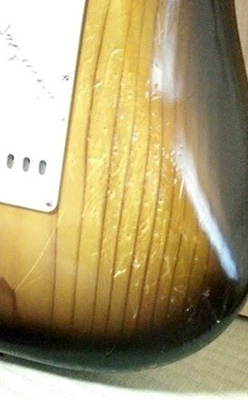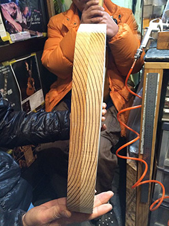 | でも杉の柔らかさが致命傷に。 いくら激しい演奏スタイルのIchiroさんとはいえたった1ステージで傷だらけ。 ベルトのバックルやステージ衣装の光り物がこんな悪さをするのですが、そんなことはせいぜい塗装が剥がれる程度で素材は耐えなきゃいけないんです。 1950年代中期のギターやベースがビンテージ物として数百万円の価格で取引きされているのはご存じでしょうか? しかも多くは今だ現役としてステージで演奏されています。 つまり50〜60年は持たなきゃダメなんです。 写真を見ればどんな傷つきかたをしているのかは解ると思いますが、損傷が激しいのはやっぱり早材部分で晩材には殆ど損傷が見られないのです。 *スギダラ読者なら早材と晩材の違いが解る前提です、解らにゃググって来い( ̄Д ̄)ノ! |