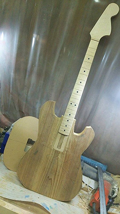 製作者のセナ・ギターズの前田氏と仲間のミュージシャンの山村氏が、 「あの人材木屋さんだし、楽器もちょっとかじってるみたいだし。」 相談を受けた私は当然のごとく彼らに言ったことは強度面にしても材の品質のバラつきにしても、 今まで私が出逢った国産材のギターは、 なんて程度の話しか周りになかったので本気度0%ながらも「杉ちゃんST一号」を見るために前田・山村両氏の所に行き、ちょっとだけ触らせてもらうと。 「へぇ〜、ちゃんと鳴るじゃない^ ^。」 ネックとボディの接合部の強度不足を補う為の工夫(写真も有るけどパテントの関係で公表できません)や、音域の補正をする為にメーカーと開発したピックアップを見て本気度急上昇! |