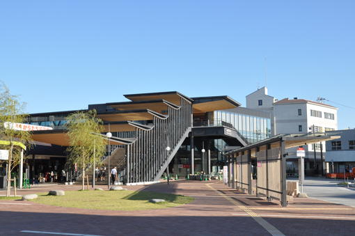 | 西鉄柳川駅西口駅前広場(自由通路・駅舎やバスシェルターの天井材には、温かみある地場・八女杉 が多く用いられ、来訪者をお迎えしてくれる。 | ||||||||||||||||