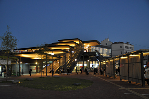 | 西鉄柳川駅西口駅前広場(夜景)。南雲氏デザインの街路照明は、自由通路やシェルターと一体的に 優しい明かりで広場空間を包んでくれる。 | ||||||||||||||||