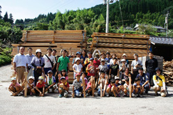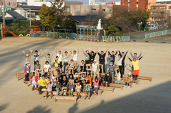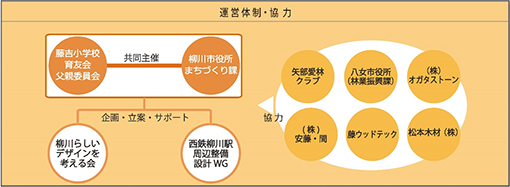 このワークショップでは、児童のお世話をしていただいた藤吉小学校育友会父親委員会の橋本憲之さんや矢ケ部智博さん、本田浩樹さん他委員や保護者の皆さん、杉のお話をしていただいた矢部村愛林クラブ会長栗原さん、八女市役所林業振興課若杉係長(当時)、製材体験をさせていただいた諸冨林産興業さん、石材のお話をしていただいた潟Iガタストーンの緒方さん、木材を提供いただいた松本木材鰍ウん、フェンスの材料加工や取り付けで協力いただいた藤ウッドテック鰍ウん、活タ藤・間さん、西日本鉄道叶路課の皆さんなど、回を追うごとに多くの関係者の協力と支援があり、参加人数も増え、子どもたちと保護者の笑顔も数多く生まれました。