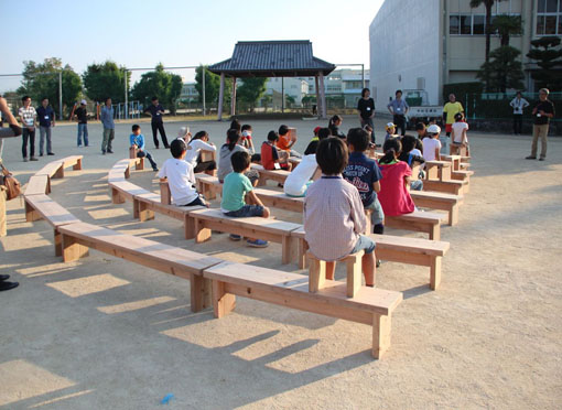 | 「新しくなる柳川駅周辺のまちづくりへの参加により、地元への愛着心を育むこと」 「まちづくりへの興味を深め、将来のまちづくりの担い手を育成すること」を目的として 「banco(バンコ)」30 脚、杉製フェンス70m。 昨年度、小学生がつくりあげました。 banco は柳川で一昔前まで各家庭の玄関先にあった、タタミ一畳分・高さ60cm 位の杉の工作物で、農繁期には家に上がらなくても昼食が摂れる食卓として、また学校帰りの子供達の遊び台として、はたまた風呂上りの爺ちゃんの夕涼みベンチとして、ユーティリティ溢れる存在でした。 今では、川下りのドンコ船に乗せられた椅子として観光客をおもてなしています。 そんなbanco と杉製フェンスをつくる前に、「素材探しの旅」と題してのイベントを開催。 水郷柳川の水源、東30km 程にある矢部村を訪れ林業従事者の話を聞き、それとなく森の大切さを学び、知識を得た子供達。 そこで南雲さんのサプライズ提案が! 「製材作業とか見れないの?」 スタッフ顔面蒼白になりながらも。森林組合さん等のご好意により、急遽工場見学&製材体験。 子供達は興味津々、我先にと作業体験に名乗りを上げ、普段の生活ではあまり見ることが出来ない屈託の無い笑顔で楽しむ姿と真剣なまなざしに、大げさですが日本人が持っている潜在的なモノづくりへの情熱が垣間見えたように思いました。またこれが、その後のワークショップの盛り上がりの原点となったように思います。 |