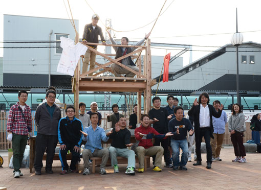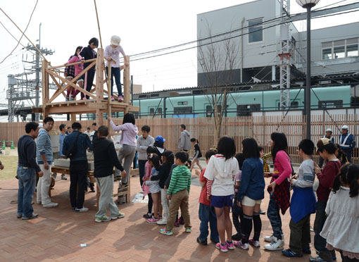 最終ワークショップは杉フェンスの取り付け70m。と父親委員会でつくった「ヤタイ」のお披露目。 当日、仕事が忙しくてやはりヤタイ製作は無理でしたと、設計チームに伝えると、最後にコケたな橋本的な冷たい眼差し。 |