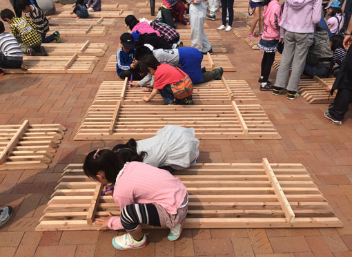 | banco づくり本番は、子供も親も初体験づくし。面とりカンナや電動ドライバーなどを使い木材加工、やすりによる仕上げ作業。四苦八苦しながら一生懸命取り組み30 脚つくり終わる頃には、大工さん顔負けの手際の良さにビックリさせられました。 ここでもやはり目に焼きついたのが、真剣な眼差しと屈託の無い笑顔でした。第3 回ワークショップは杉のフェンスづくり60cm の1 ユニットを120 セット組立て。 「案ずるより生むが安し」の言葉がぴったりあてはまるように、子供大工さんたちの段取り良くまた手際良く製作される姿にWS の名を借りた労働ではないかと疑問に思う場面も(笑)。 |