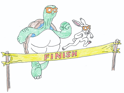 では、皆さまの予想を裏切って、前回の続きを。(笑) なんだかんだでスギタート(「スタート」のスギ語)した、ウサギの「ウサ男」とカメの「飫肥杉仮面カメ」。スギタートダッスギュ(「ダッシュ」のスギ語)から、いきなり差がついた。ウサ男は速いのなんの。全力疾走ではないものの、アッという間に、見えなくなった。 それでも、カメんは、精一杯の力で1歩1歩、ゴールの山頂を目指した。一方のウサ男はというと、もうゴールが見えてきた。「楽勝。楽勝。楽に勝つ」と言って、気持ち良さそうな木陰を見つけて、ヒトヤスギ(「一休み」のスギ語)。の、ツモリがついウトウト。 「寝スギた!」よだれを拭きながら、ウサ男はピョンと跳ね起きた。でも、カメんはまだまだ後ろだろうと思い、スギャップ(「スキップ」と「ギャロップ」をミックスした特殊走法)でゴールを目指した。「なぬぅ〜〜〜〜〜〜!!!」ゴール目前のカメんを発見。 「どうしよう。どうしよう。負けたくはない」ウサ男は、汗った(汗ダクで焦る様子)。耳をフル回転させて考え、ひらめいた。「そうだ!アレだ!」飫肥杉製の仮面を取り出し、変身した。この仮面の良さを紹介しよう。「@いつでも、どこでも、誰でも、木軽に木楽に変身できる」「Aいつもより勇気が出て、普段より大胆になれる」「Bワンコイン」 飫肥杉仮面USAは、自己ベスギト(「ベスト」を出しそうな「汗ギト」なさま)で駆け抜けた。そして、ゴール寸前で、カメんに追いついた。そこで、素直にカメんに言った。「はあ、、、はあ、、、はあ、、、君を馬鹿にしていた自分が恥すぎしい(「恥ずかしい」のスギ語)。君の根気には参ったよ。。。」 それを聞いたカメん。「あなたも、スギぇ〜ですね。まさか追いつかれるとは思いもしませんでしたよ。よく、あそこから、こんな短時間で、ここまで来ましたね」お互いに称え合って、せーの!で一緒にゴールした。2人とも、スギバラシイ笑顔を見せながら。そして、2人で、芋焼酎「飫肥杉」でオユワイ(「お湯割り」で「お祝い」のこと)した。 さて、このお話。皆さんが知っているストーリーとは、少し違ったかもしれません。でも、ボクが描いた物語は、これでした。コツコツと自分のペースでがんばったカメは、もちろん偉い。でも、ウサギにもチャンスを与えたい。ボクは、こう思うのです。 「遅すぎるコトなんて、本当は1つもありは、しないのだ。」 思うこと。考えること。気付くこと。そう、それが大事。 楽してきた分、手を抜いてきた分、人並み以上の頑張りが必要かもしれない。でも、やれる。あなたが、そう思い、考え、気付いたのなら。あなたの「ヤル気スイッチ」を押せるのは、あなた自身だけ。誰かの何かがキッカケかもしれないが、最終的に押すのは、あなた。オスだろうが、メスだろうが。その中間だろうが。 「後戻り」は許されていない、1度きりの人生を、片道切符のこの人生を、何かのため、誰かのため、そして、自分のために走っている、すべての皆さんにエールを込めて。 |