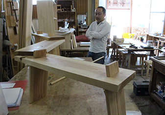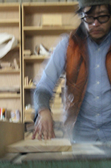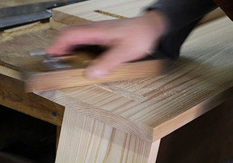 | 座面を仕上げる鉋の音が気持ちいい。金物を使わず、30φの軸棒に9φの込み栓でこれまでで最強軽量化実現。 | ||||||||||||||||