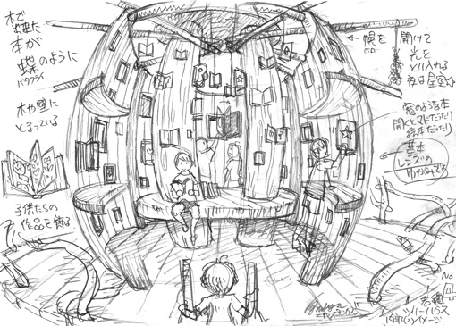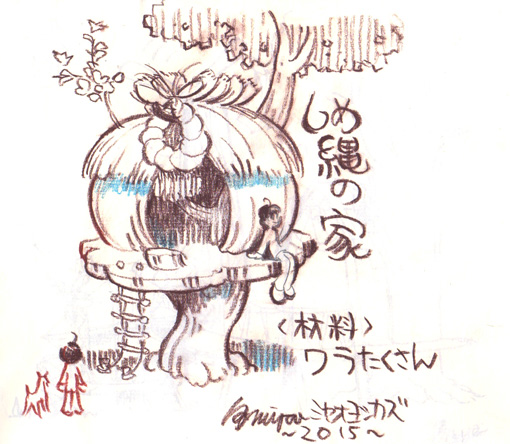 | 「ワラ」=「稲」しめ縄に象徴されるように豊作祈願の象徴で農業とは深い関わりを持つ藁をモチーフにしました。 そこからセーラさんのご子息ウイリアム君が好きな「マジックツリーハウス」(メアリー・ポープ・オズボーン著) という童話に登場する「本の世界を旅する事が出来るツリーハウス」をモチーフにする アイディアが生まれる。これを踏まえハウスのイメージを数点描きました。 |