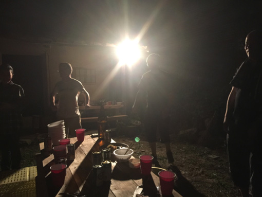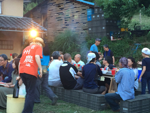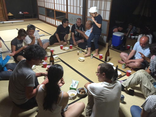 山と月の下で、ビール箱を台に瓶のマイクでヨサクを歌う光景はもう何かの物語を見ている様です。こんな風に上と下、横との繋がりの場から文化は伝えられていくのかな。と地酒を開けながら思いました。 |