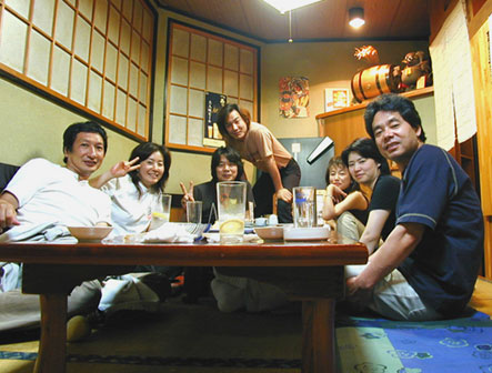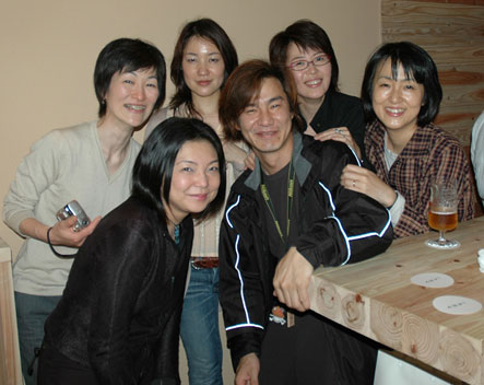 会って最初にその一刀両断の餌食になったのは、この3姉妹を結びつけた張本人、モクネットの加藤さんでした。モクネットの事務所の庭にフォレストボードという杉樹皮や端材を細かく砕いて固めた製品が敷き詰めてあるのですが、そのボードを敷き詰めるための枠に天然秋田杉の柱材を使っていると加藤さんが自慢?しているのを聞いて、「無駄に豪華」とばっさり(涙)。 外見の雰囲気からは想像できないお言葉に凄まじいインパクトを受けた3兄弟でした。そもそも小林さんは以前モクネットの秋田事務所に勤められていたそうで、菅原さんとは加藤さんを通じて知り合ったとか。渡辺さんもそうです。美女の影に加藤あり!って感じでしょうか? 秋田おばこ3姉妹に囲まれて加藤さんもご満悦でした。本部の3姉妹に支えられてる3兄弟と似ていますが、加藤さんは独り占めしているところが羨ましいですな。