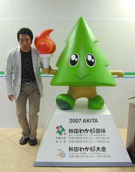 おまけ:2007年秋田わか杉国体のマスコット「すぎっち」と記念撮影する若杉さん。