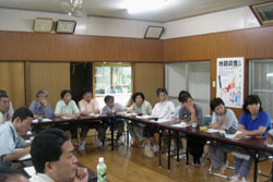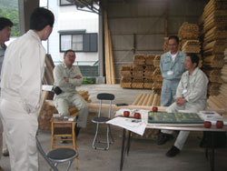 上崎地区は温暖な気候と緑豊かな環境に恵まれ、みかん、桃、梨などの果物が一年中出来ることで知られている。糖度はピカ一らしい。ボクも食べたことがあるが本当に甘い! 五月の新聞に上崎地区ふるさとづくり促進協議会会長の甲斐さんが桃の収穫をしている様子が新聞に掲載された。 ●その後 さて本誌6号のかみざきものがたり、すぎだらな人々、そして9号で紹介してきた、上崎地区ふるさとづくり促進協議会(以下ふるさと協議会)主催によるワークショップは地区住民、九保大、スギダラとスクランブルしながら2回開催された。(第2回が2月18日)その努力の成果である上崎橋の高欄用杉材は伐採、葉がらしを経て、玉切り、切り出しと順調に進んでいった。この模様は東臼杵振興局によって「林道」という専門誌にも掲載された。(みなさん頑張っています。) 5月17日。福岡の帰りに上崎に寄る。高速バスで4時間の旅だ。笠木の杉は、乾燥、丸加工の工程に移っていった。高欄への取付方法等を検討するために大まかな試作を製作、それを見ながらもう一度地区民による取付を前提に詳細検討、そして完成までの今後のスケジュール等が話し合われた。地味であるがこの辺は大事な技術的な打合せである。これなくしてイベントは出来ない。 またふるさと協議会からは来訪者に気持ち良く地区内を散策してもらえるよう、案内板、ベンチ等を製作していくことが報告された。また現在の地区センターの入り口に杉のシェルターを架け、効率よく共同作業が出来るためのスペースをつくることになった。地区は地区で盛り上がっているようだ。 そうこうしているうちに確実に上崎橋の工事は進んでいった。 ●日向打合せ その一ヶ月後、6月20日。最終的な詳細の詰めが関係者がなぜか日向市役所に集まり検討会を開いた。(理由は簡単で前日、小野寺さんとともに日向で打合せがあったので、こちらまで来ていただいたのだ。)親柱、袖柱、防護柵など一連の最終打合せを行った。 そして橋梁の完成予定から地区のイベントの日程を割り出し、今後のワークショップの日程、回数、規模と最終的なイベントの規模、内容などを話し合った。結構時間がない、結構やることがたくさんある。そして戦力に期待していた九保大の学生が大学のカリュキュラムの関係でなかなか参加出来そうにないというマイナスの条件も加わった。さらに地区側からはワークショップの集大成としての完成イベントと別にもう一本、念願の橋の完成を祝うイベントは別に行いたいという一見不思議な話が登場した。 理由は念願の橋の完成を祝うイベントはどちらかというとオフィシャルなもので、それなりの関係者が集まり、故郷を離れた出身者にも参加してもらい、みんなで祝うということなのだが、突き詰めるとそれは行政の正式な竣工式とセットでないと意味がないということらしい。そして両方のイベントは地区にとって負担も大きいとの意見も出された。 理由はわからなくはない。 我々は行政の竣工式はお飾りで、市民主導の完成イベントの方が何倍も価値があるといってきたが、それは言ってみれば単に好きな人が内輪でやることに過ぎないのだ。(おそらく比率でいえば前者の方が格が上という考え方は普通に当たり前なのだ。)地元に負担をかけてまでやっても意味がない。少し動揺しながら、ちょっと時間をかけ整理しましょう。ということになった。とはいえ、もう6月も半ばの事だ、当初予定していた7月のワークショップはとりあえず中止。その先のスケジュールを具体的に詰めながらの話だ。 ●再び上崎地区へ そして7月6日、イベントに関する調整会議が地区で行われた。今後のことを考えるとこの時点で地元としての最終判断をしないとあとの作業が動けない。また、言葉ではわかっていても具体的なイメージが湧かない高欄取付作業に対する説明を、原寸試作を前に説明を行い、実際のイベント当日のタイムスケジュールが検討された。意見は一枚岩ではなく、時間も延長して真剣な議論が続けられた。 そして大きな方向性が確認された。(1)行政の竣工式(市主催)は地区民総出で行う。これは地区主導、婦人部を中心にお客さんをもてなす。(2)そしてその前日、ワークショップの集大成としてのイベントを行う。メインメニューは地区民全員による高欄笠木の取付、それに加え現在運休中だが、長い間(昭和12年以降)お世話になってきた高千穂鉄道(07号参照)、上崎駅周辺を休息の場として修復、線路上もトロッコ的な機能を持たせ地区として愛情を持って活用していこうというもの。これはふるさと協議会主催で行う。九保大、スギダラが協力する。