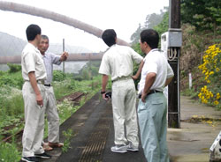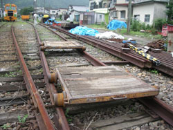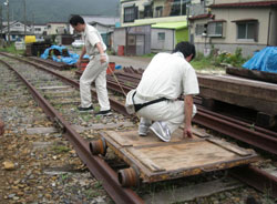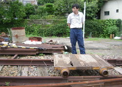 施設の残務処理などを細々とやられている。保線の話には何十年と高千穂鉄道を守ってきた自信と、その合間にふっと覗くあきらめとも言える表情が何ともいえず辛そうだ。 しかし、上崎駅の企画を話すと、「駅や、線路を大事にしてくれる話には最大限協力しますよ。イベント時の安全確認も行いますよ。」涙ぐましいお言葉だ。一日駅長決定。 「うまくいくといいですね〜。ずっと続くと。ただし、施設が撤去されるまでの話ですけどね。」そういわれて、これは上崎エリアだけでも地区で払い下げてもらうしかない!と勝手に思ってしまった。 とにかくおもしろいことになってきた。 線路を利用するには台車がいる。その辺に転がっているモノを見せてもらった。あるある、ゴロゴロころがッている。「いっぱいあるじゃないですか〜」思わず叫ぶと、「全部使えるわけじゃないんですよ。管理会社の分もあるし。それに今でも保線は行っていますから、ウチでも使っているんですよ。」 そりゃぁそうだ。出来るだけ傷んでいるモノを集中的に探す。そして何とか2台ほど借用出来そうなものが見つかった。感動の瞬間である。 しかし、当面は安全上の問題からも手押しが良いと思っていたボクは、それが一体どの程度の力で動くのか、不安であった。さっそく台車を線路に載せてそろそろと引いてみる。するとほんのちょっとの力でスルスルと動き始めた。鉄道ってすごい! 再び感動!「もっとたくさん乗って下さいよ。」三人載っても片手でスルスル、「いける!」確信出来た瞬間であった。 その後、上崎橋の現場に戻り橋詰め部の打合せ。ヘルメットをかぶり、久々の本業打合せだ。親柱、袖柱の収まりチェックだ。(以下略)すべての打合せが終わり、にやにやしながら山を下る途中、タイミング良く若杉さんから電話が入る。相手の用件を聞く前に思わず叫んだ。「台車うまくいきました〜」 さて台車の上に何が乗っかるか、駅舎はどうなるか? 次号に続く。