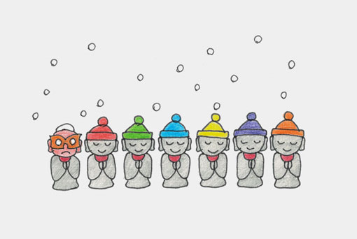 とぼとぼ歩きの帰り道、ちらちらと雪が降り始めます。峠に差しかかったときにはすっかり吹雪になりました。ふと見ると、道端にお地蔵さんが7つ並んでいます。